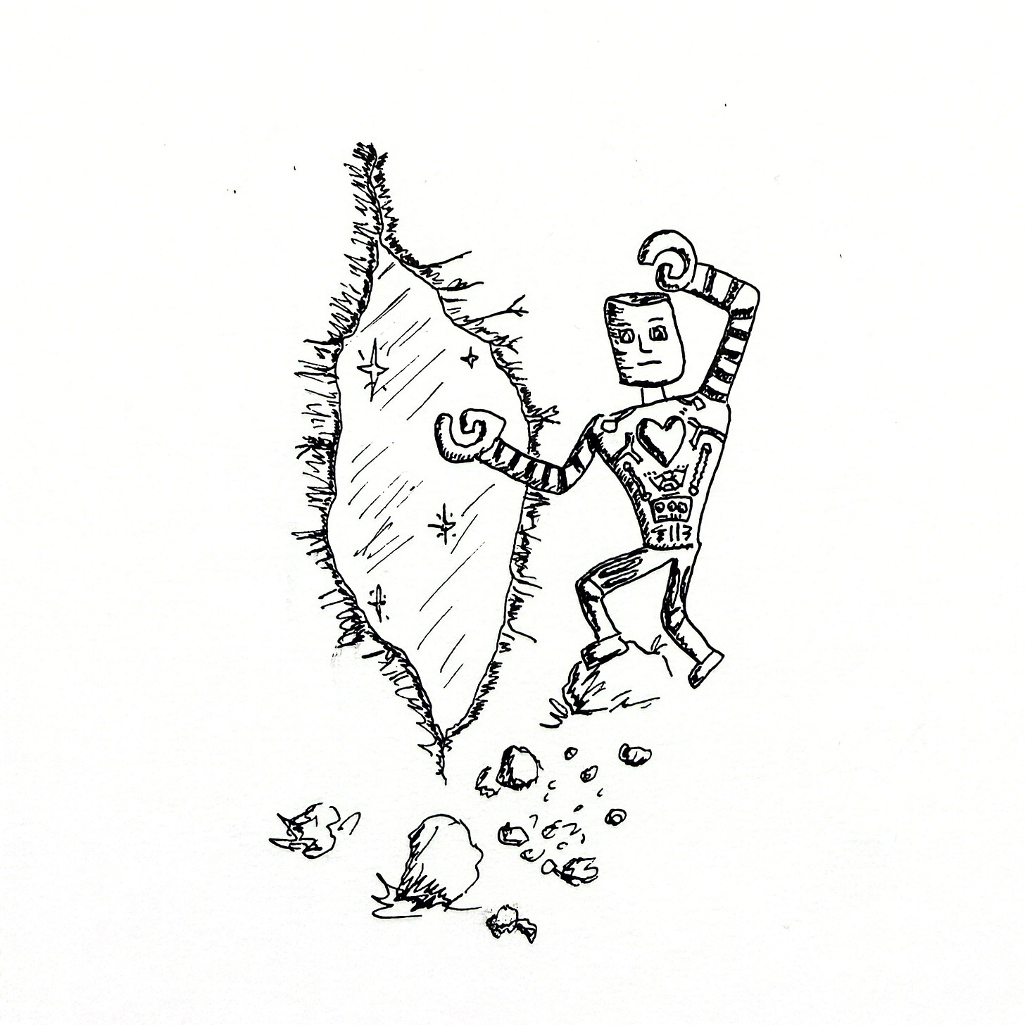 Deep he had travelled into the forest before he found a great rocky hill that his sensors informed him had empty pockets of air, hidden from view. For days he chipped away at the thinnest spot, until he could finally squeeze through. A cavern was revealed in the opening, dry and with walls that sparkled where the sun touched it. Something about this place struck him in a way that nothing before ever had. The minerals seemed to be beckoning him in. He cut a new door from stone and mounted it on stone hinges, locking it with a great stone wedge, making the caves invisible to outsiders. This, he decided, will be home. For as many days as I have left.